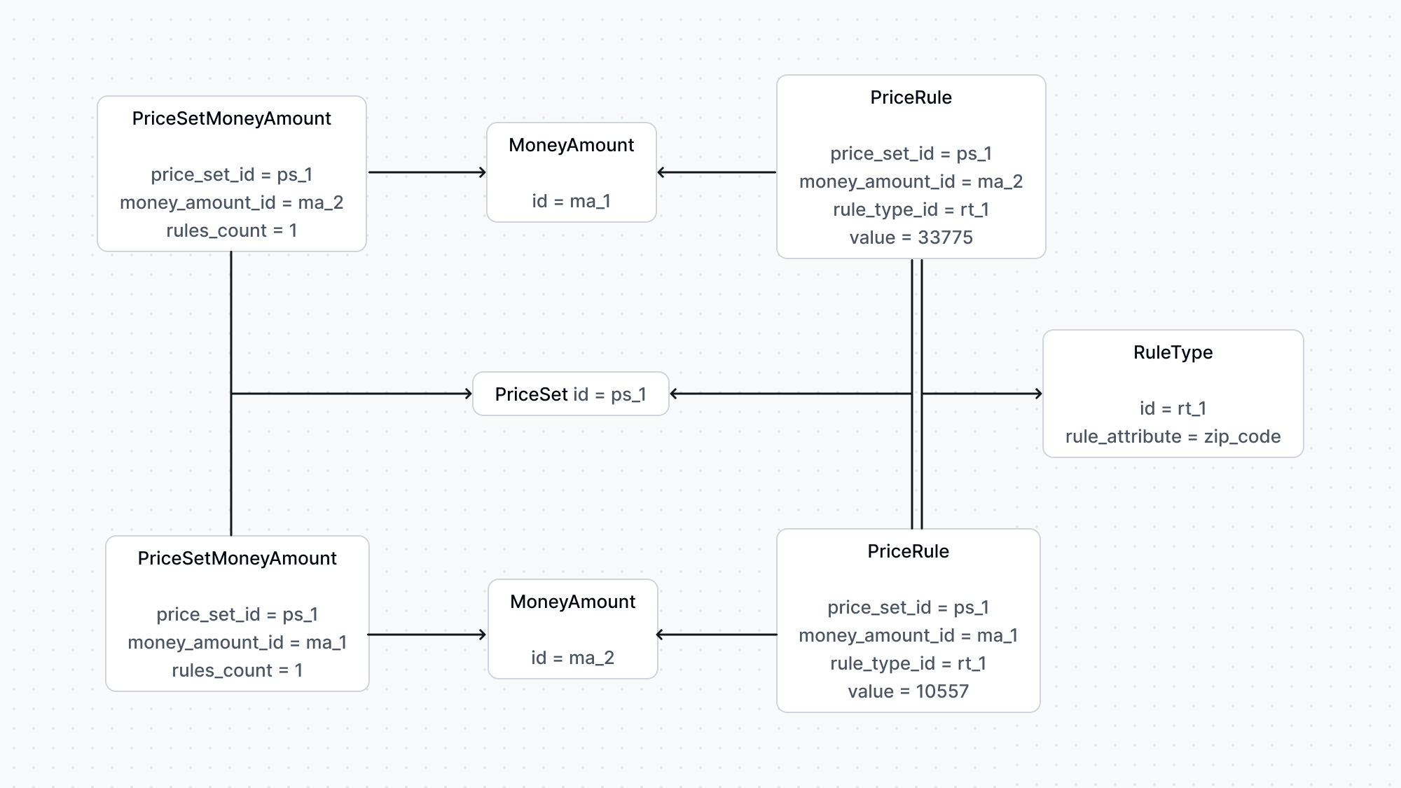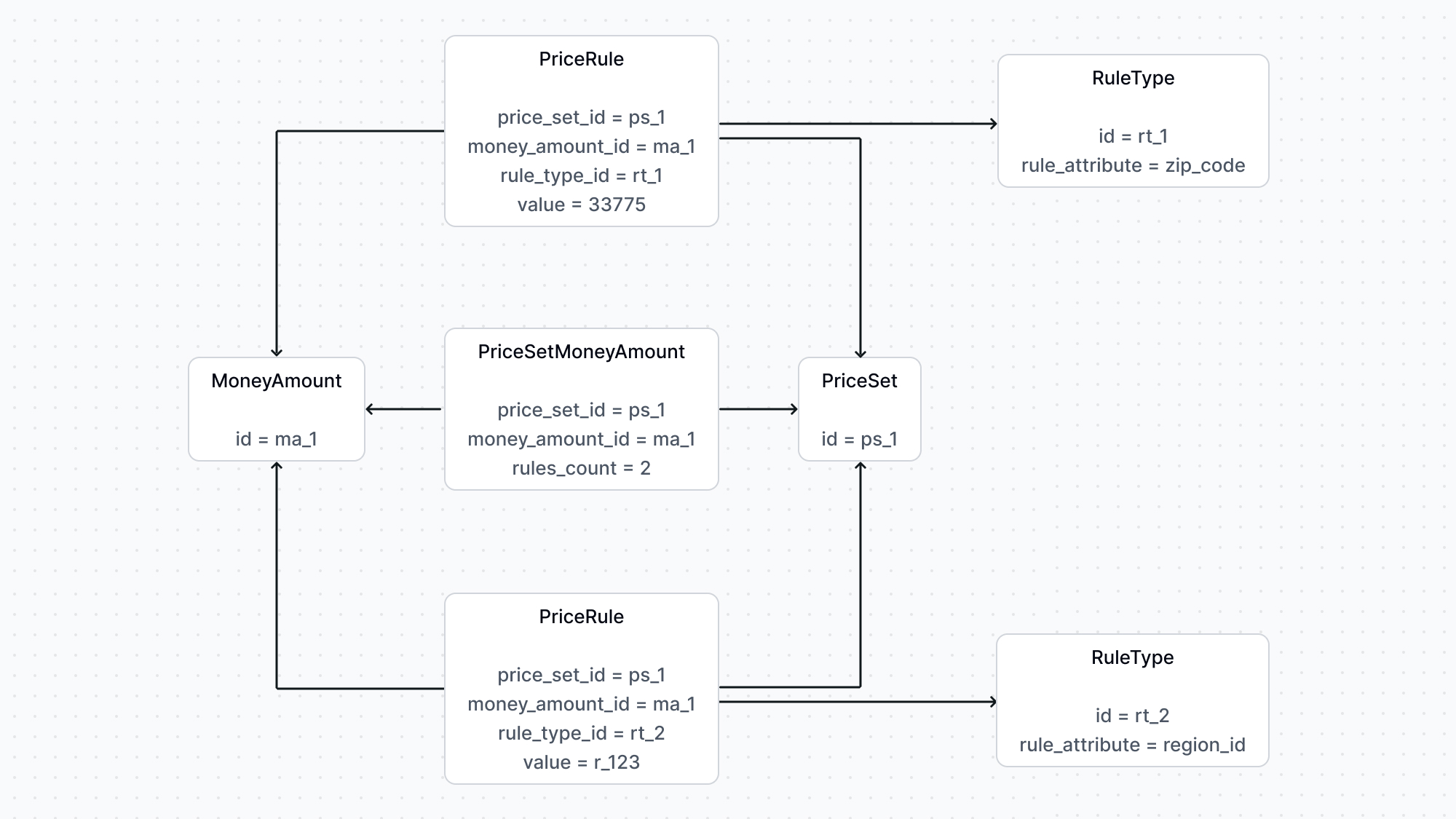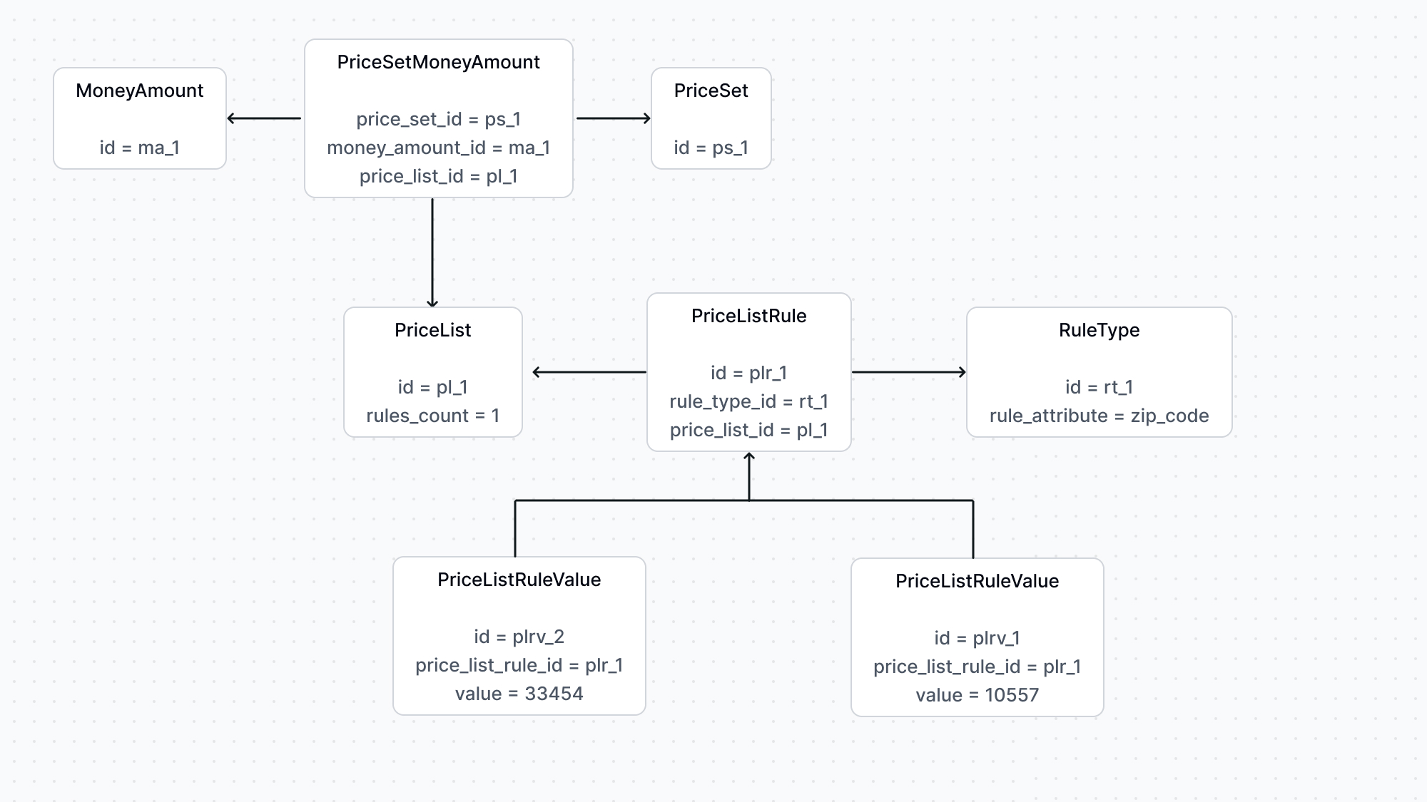 For example, a money amount can have the rules zip_code and region_id applied to it. In this case, the value of each rule is represented by a PriceRule.