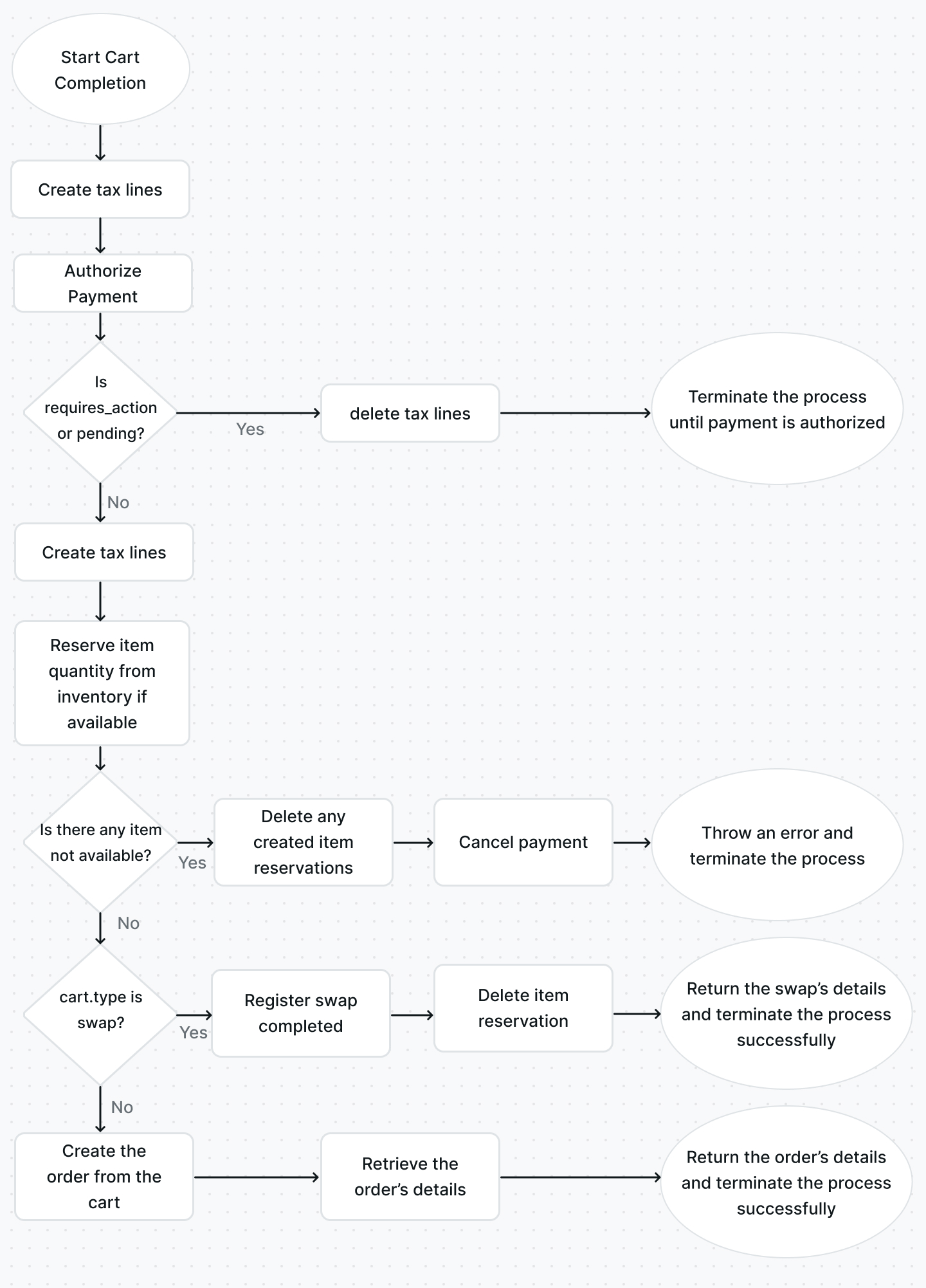 typeattribute is set toswap), the swap is registered as completed using theSwapService's registerCartCompletion method and the inventory item reservations are removed using the Inventory Module. The process ends successfully here for a swap. - If the cart belongs to an order, the order is created using the