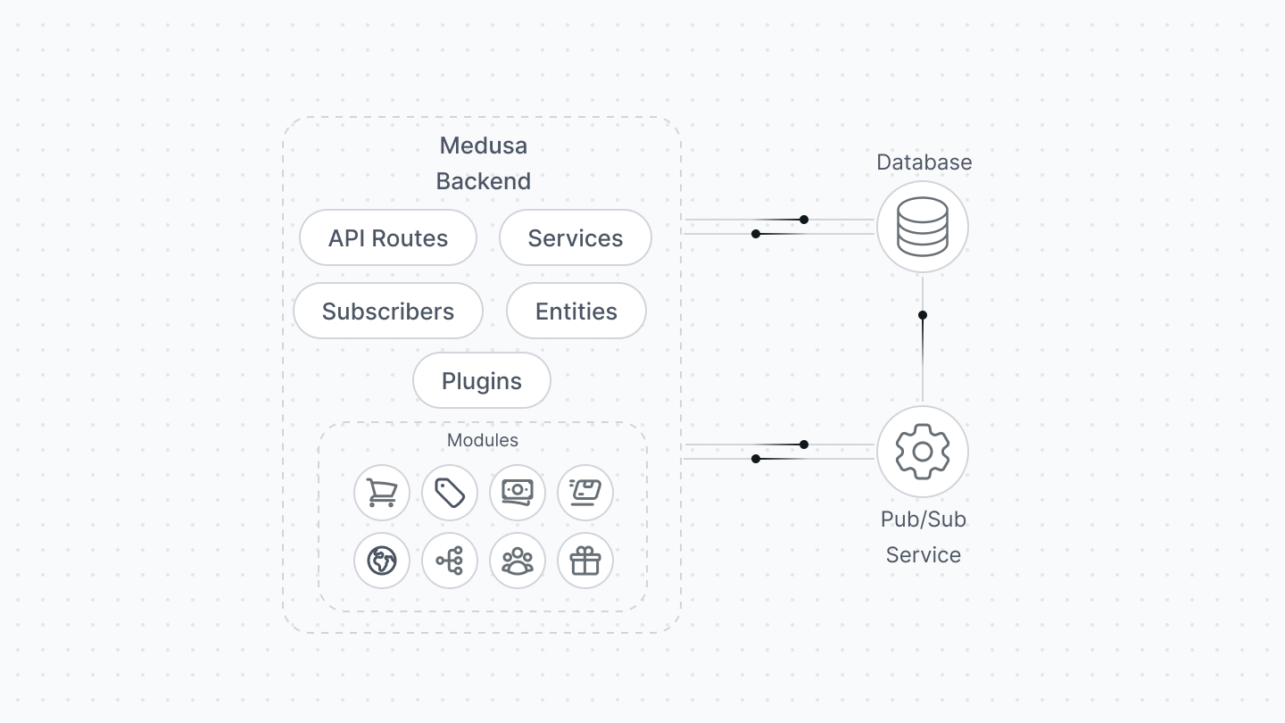 You can create any of the resources in the backend’s architecture, such as entities, API Routes, services, and more, as part of your custom development without directly modifying the backend itself. The Medusa backend uses loaders to load the backend’s resources, as well as your custom resources and resources in Plugins.